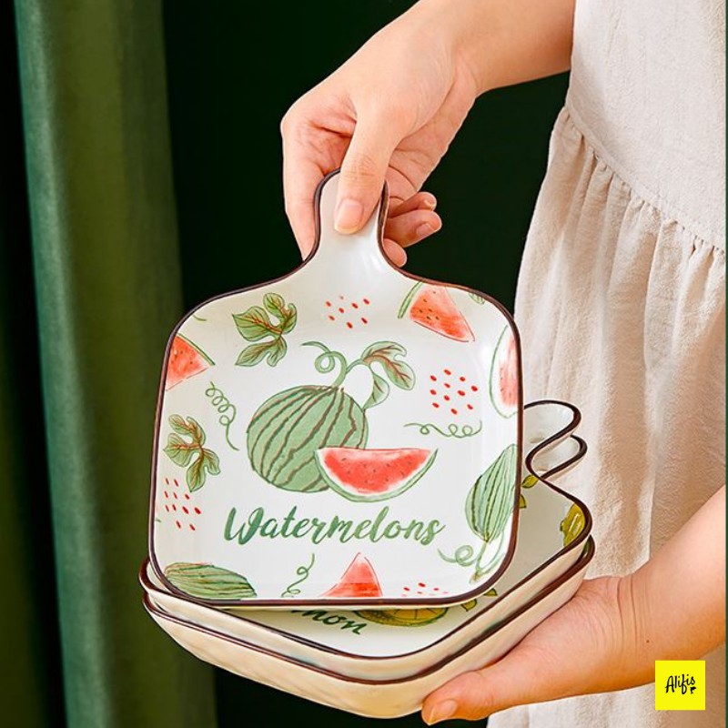 - Đĩa sứ thiết kế độc đáo với họa tiết hoa quả xinh xắn cùng tay cầm chống bỏng tiện dụng.