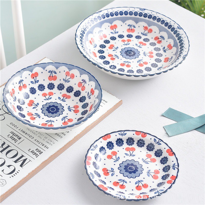 Nhà cửa & Đời sống > Bộ đồ bàn ăn > Dĩa || Đĩa sứ đựng salat, hoa quả ngộ nghĩnh họa tiết viền caro cao cấp họa tiết vẽ tayCòn hàng