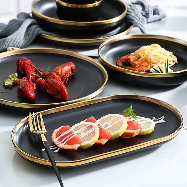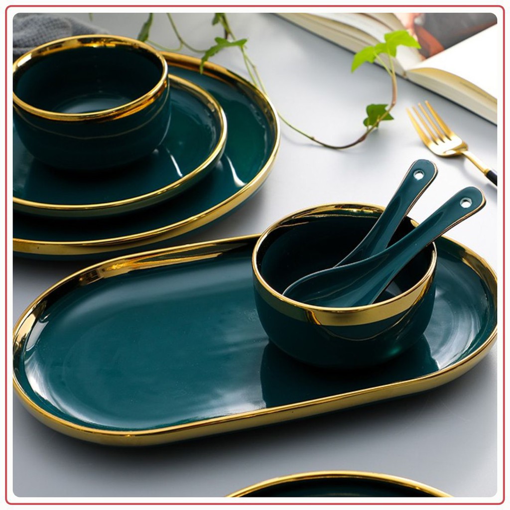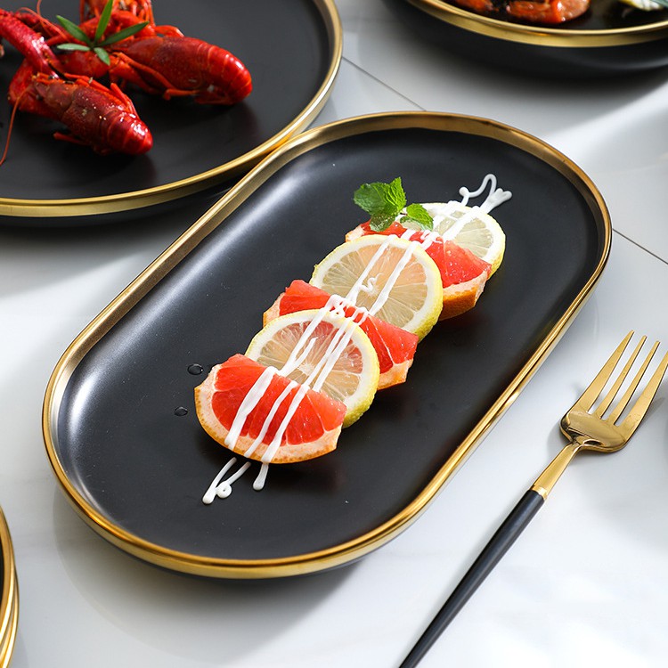 Nhà cửa & Đời sống > Bộ đồ bàn ăn > Dĩa || Đĩa sứ hình bầu dục viền vàng cao cấp size 11.5Còn hàng