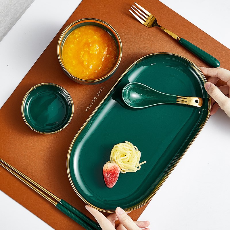 + Đĩa bầu dục viền vàng được làm từ chất liệu gốm sứ Giang Châu cao cấp, màu men sáng bóng, không chì, không độc hại
