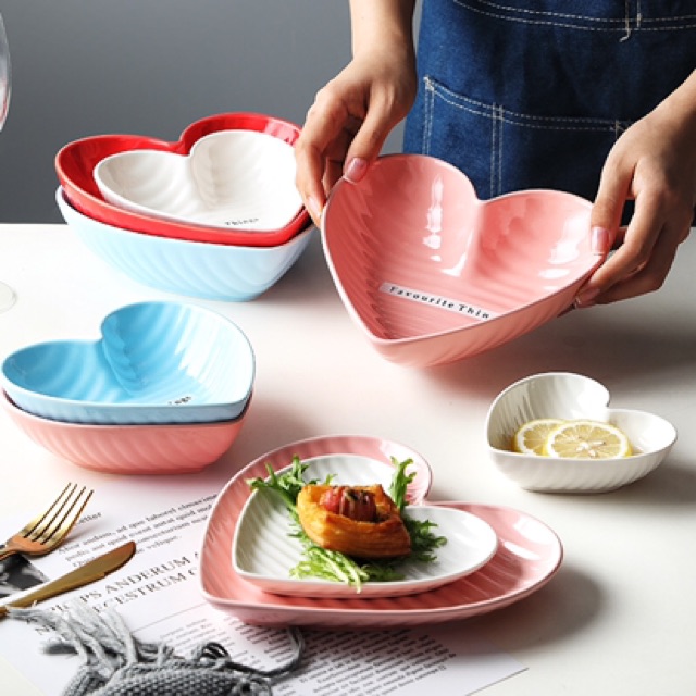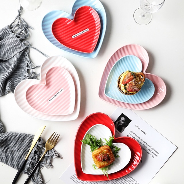 Đĩa sứ hình trái tim bày đồ ăn xinh xinh, ngọt ngàoĐĩa sứ trái tim các màu: Hồng phấn, đỏ, xanh lam, trắng