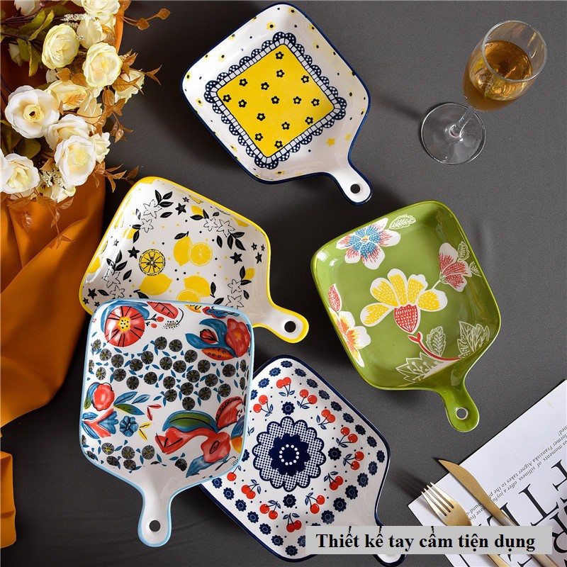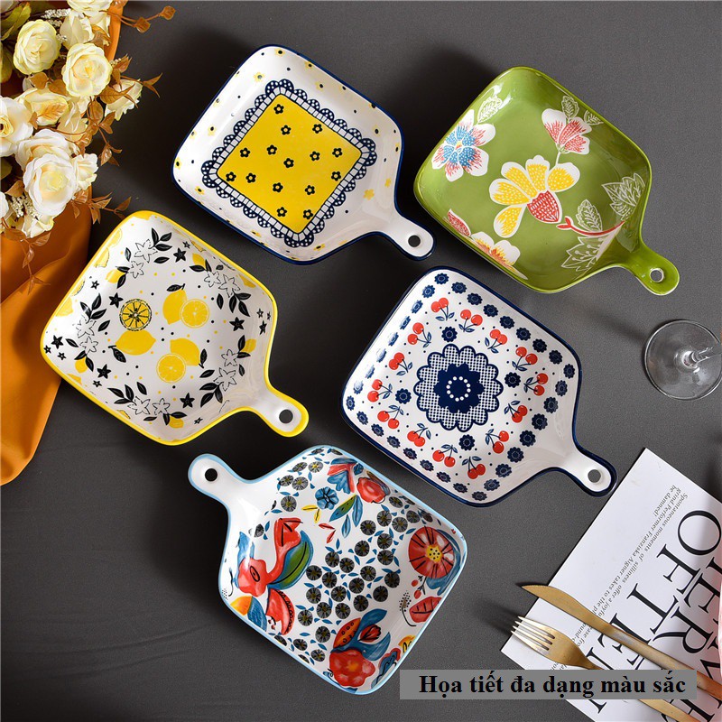 Đĩa Sứ Họa Tiết Đựng Hoa Quả Decor Trang Trí Bàn Ăn Có Tay Cầm