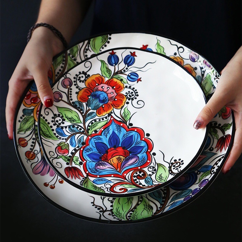 ☘Gốm sứ vẽ tay nghệ thuật , công nghệ làm màu organic được tráng thêm một lớp sứ sương trên bề mặt nền đĩa và nung trong nhiệt độ lò 1.300•C. Loại bỏ hoàn toàn tạp, loại bỏ chì đảm bảo an toàn cho sức khỏe của người tiêu dùng