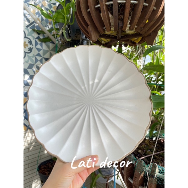 Đĩa sứ tròn được thiết kế theo phong cách Bắc Âu, tối giản mà tinh tế, trang nhã, tạo sự hài hòa trong trang trí nội thất hiện đại. Trên mặt đĩa có vân hình cánh hoa cúc xinh xắn, viền nâu được vẽ tay tỉ mỉ, tạo nên điểm nhấn độc đáo, bắt mắt.
