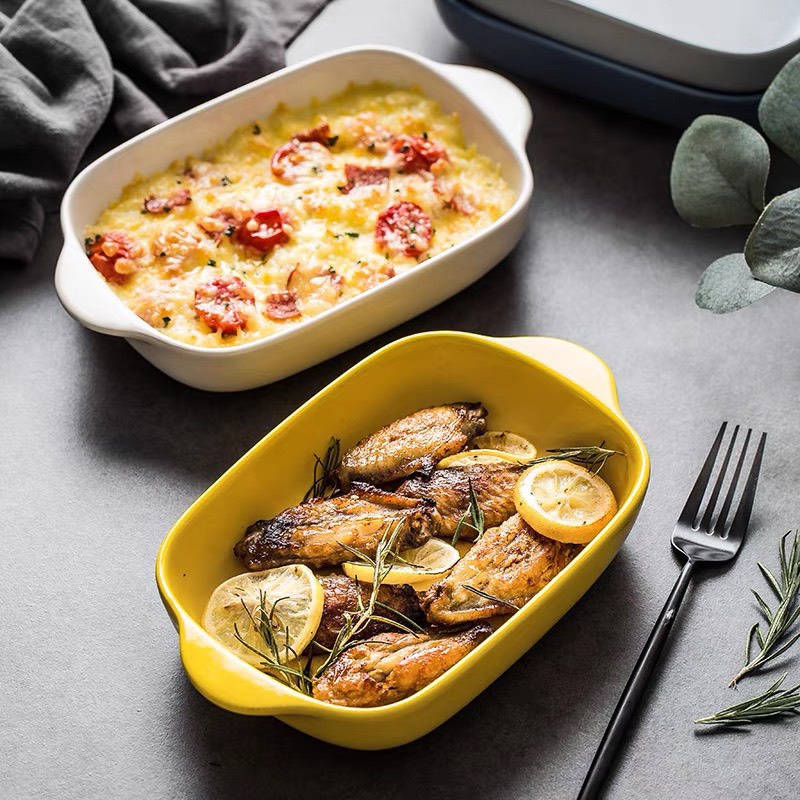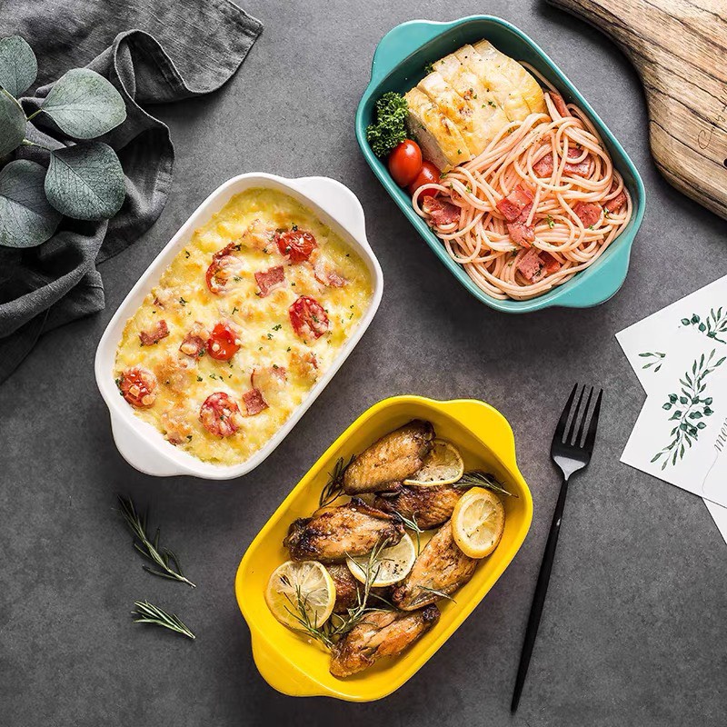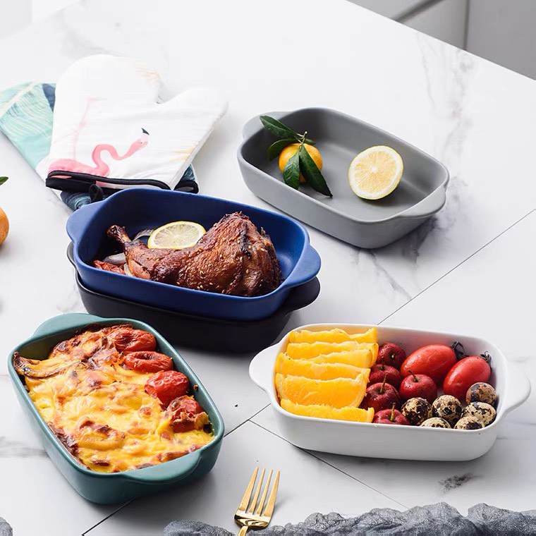 Đĩa sứ nhiều màu sắc có tay cầm, sử dụng được cho lò vi sóng hay lò nướng, trẻ trung và hiện đại