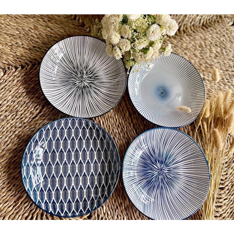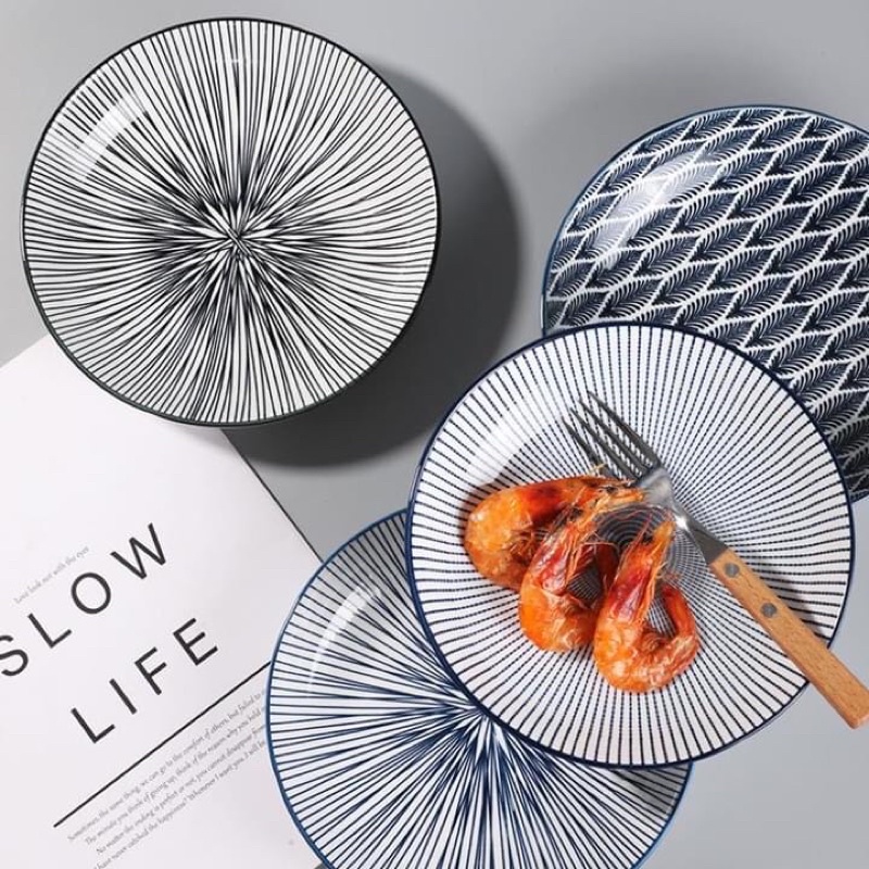 Đĩa sứ phong cách Nhật Bản,đĩa sứ tròn họa tiết size 20.5cm dùng đựng thức ăn và decor bàn ăn