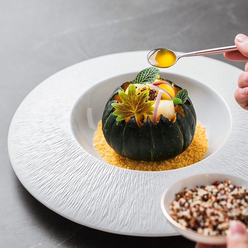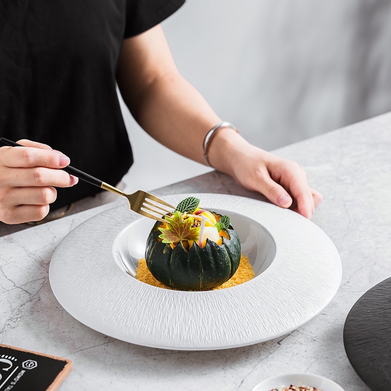 Mặt đĩa thiết kế sâu lòng viền rộng, chống xước, thích hợp cho các món Âu, sử dụng nhiều trong nhà hàng