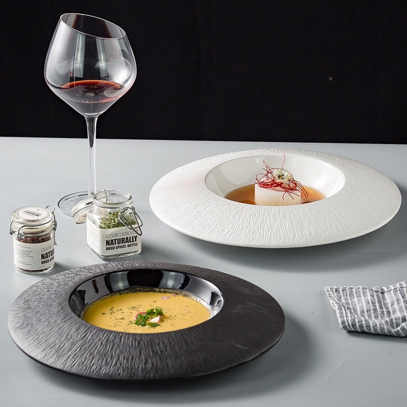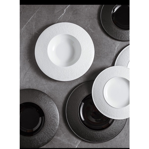 Đĩa sứ sâu lòng, Đĩa mỳ Sarang cao cấp 2 màu trắng đen, Đĩa sứ nhà hàng phong cách hiện đại