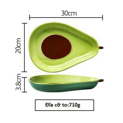 - Kích thước: đĩa hình trái bơ cỡ to Dung tích 900ml, trọng lượng 726g, kích thước 22*15,5*8 cm
