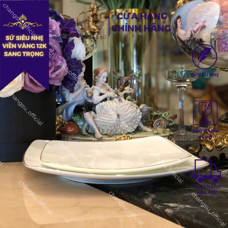 Đĩa sứ vuông viền vàng 12k sứ siêu nhẹ - Sứ xương siêu nhẹ Minh Châu