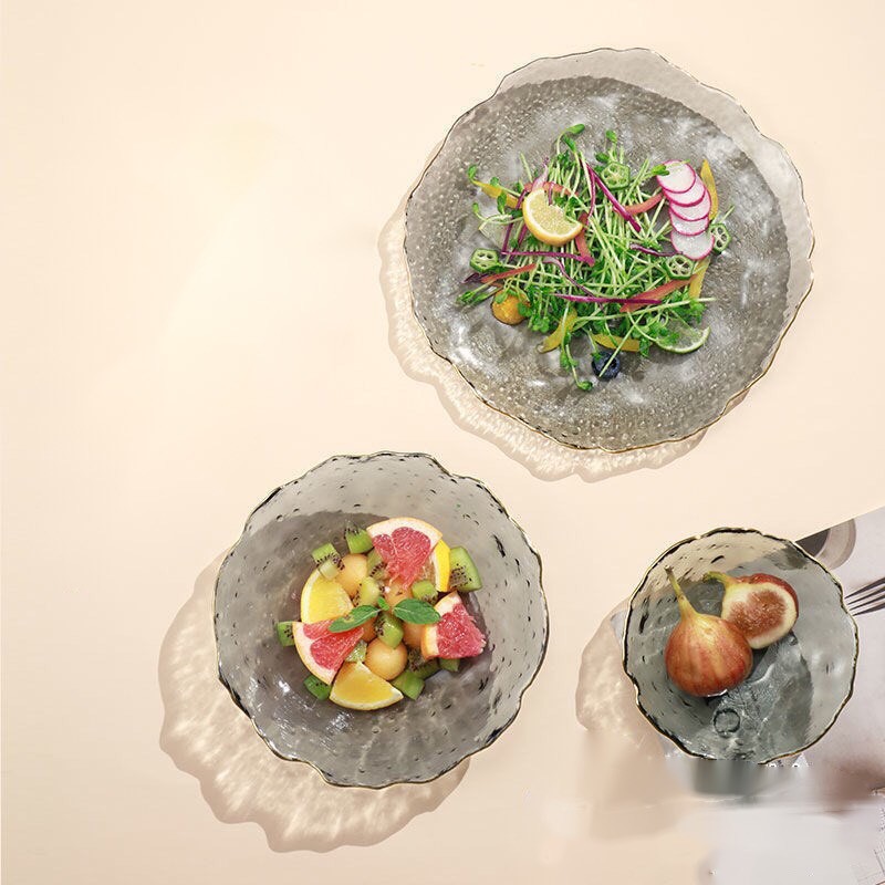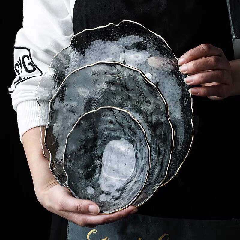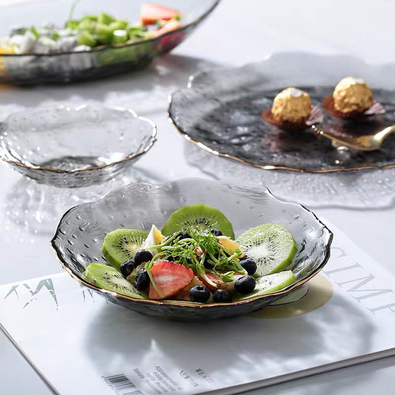 Đĩa thủy tinh cao cấp ghi xám đen viền vàng,để hoa quả,salad,bánh kẹo