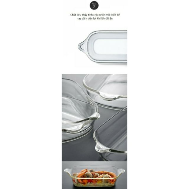 - Thiết kế trong suốt sang trọng, sử dụng đa năng tiện lợi (dùng trong lò nướng, và bày ra dùng trực tiếp trên bàn tiệc), có quai cầm.