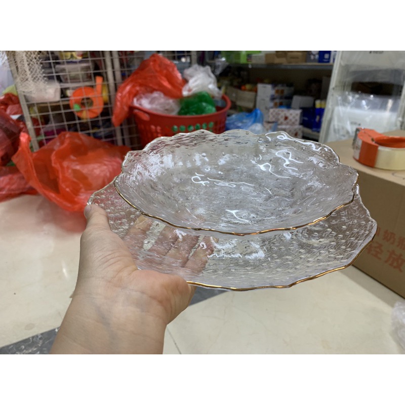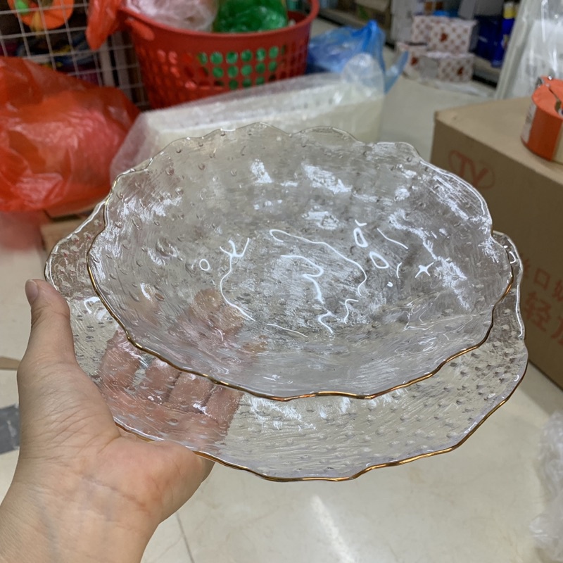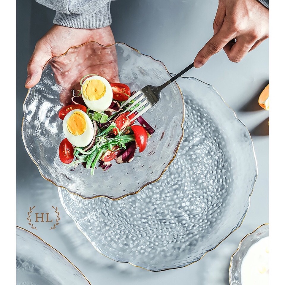 Nhà cửa & Đời sống > Bộ đồ bàn ăn > Dĩa || Đĩa thủy tinh tròn sần viền vàng miệng lượn chịu nhiệt cao cấp-HLCòn hàng