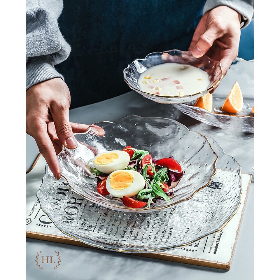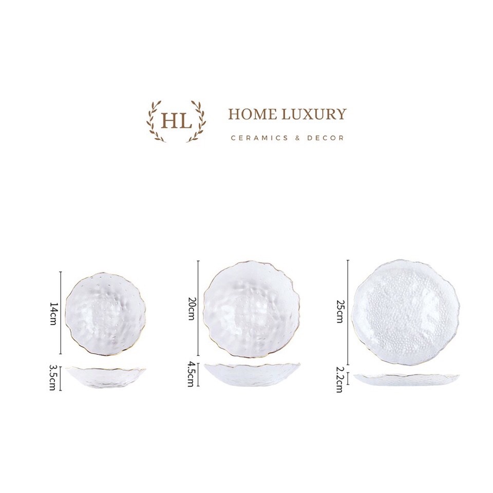Giới thiệu Đĩa thủy tinh tròn sần viền vàng miệng lượn chịu nhiệt cao cấp-HL