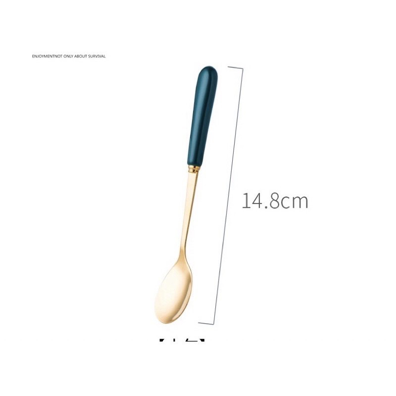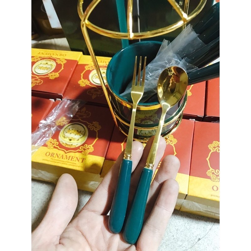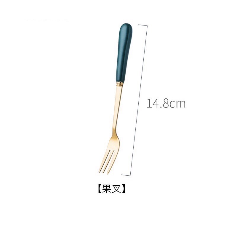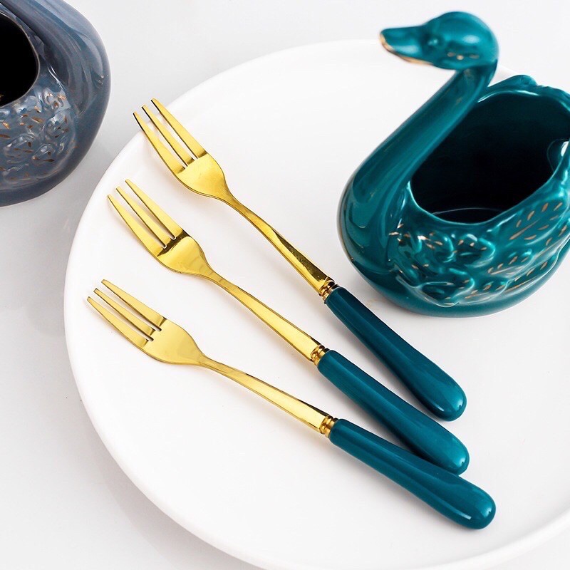 Thân dĩa làm inox không gỉ 304 mạ vàng, phần chuôi được bọc sứ men mầu ngọc lam cực sang trọng hot trend 2021