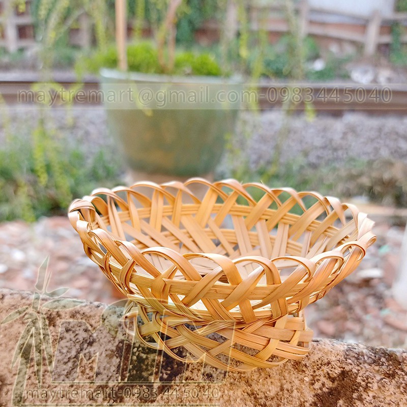 Sản phẩm được đan bằng tre tự nhiên.Đĩa nhỏ: R 8cm x D 11cm x cao 5cm.