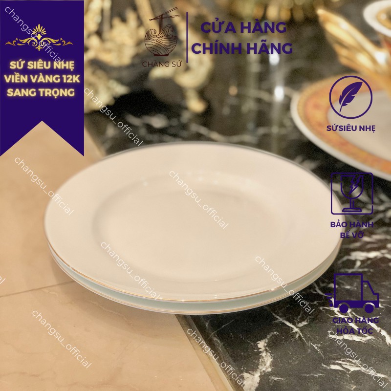 Đĩa tròn lòng nông viền vàng sứ siêu nhẹ - Sứ xương siêu nhẹ Minh Châu - Vỡ 1 đổi 1