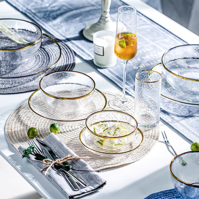 Đĩa và tô thủy tinh trắng viền vàng,đĩa hoa quả,đĩa salad,đĩa để bánh kẹo,đĩa thủy tinh cao cấp, đẹp, set thủy tinh lạ