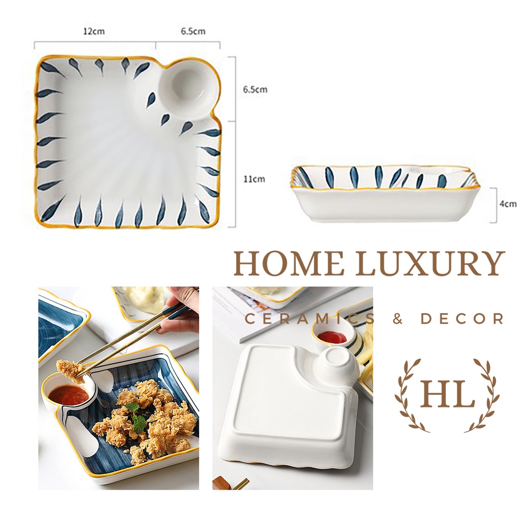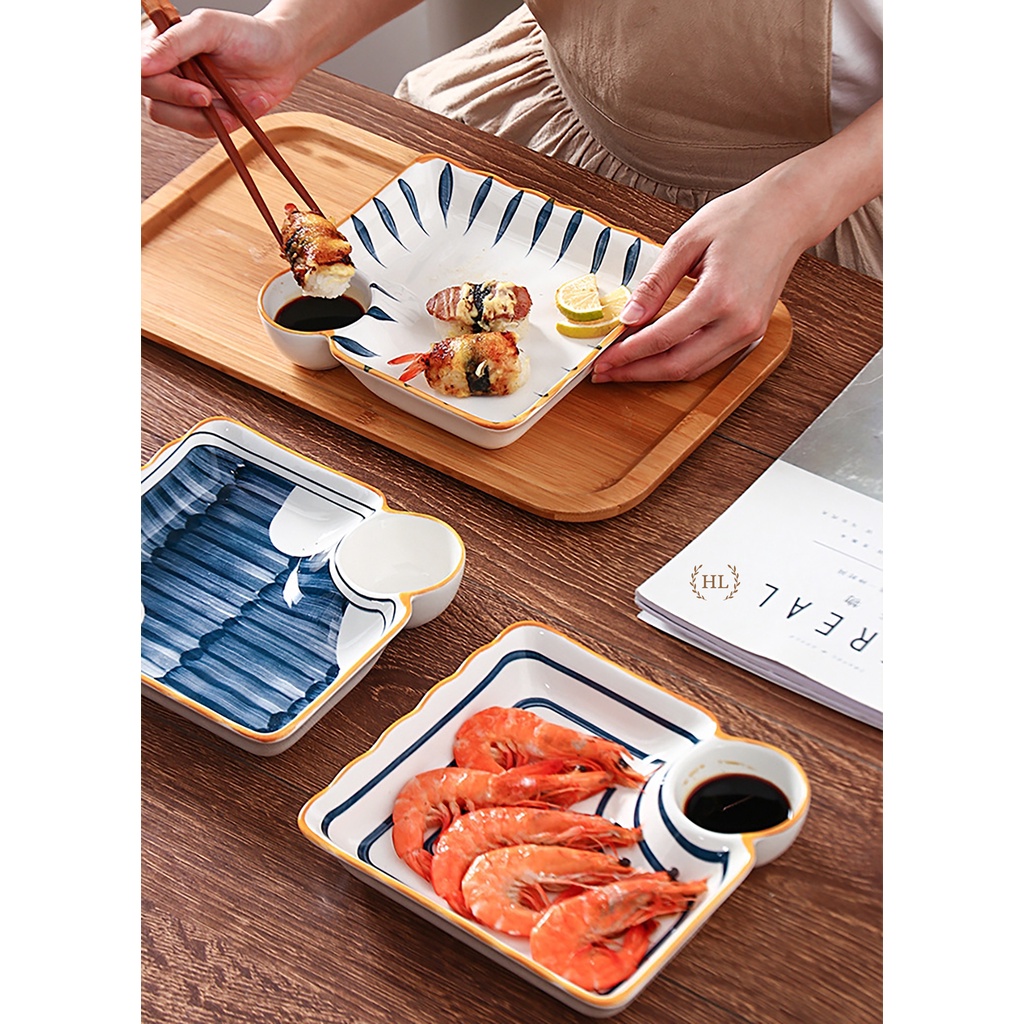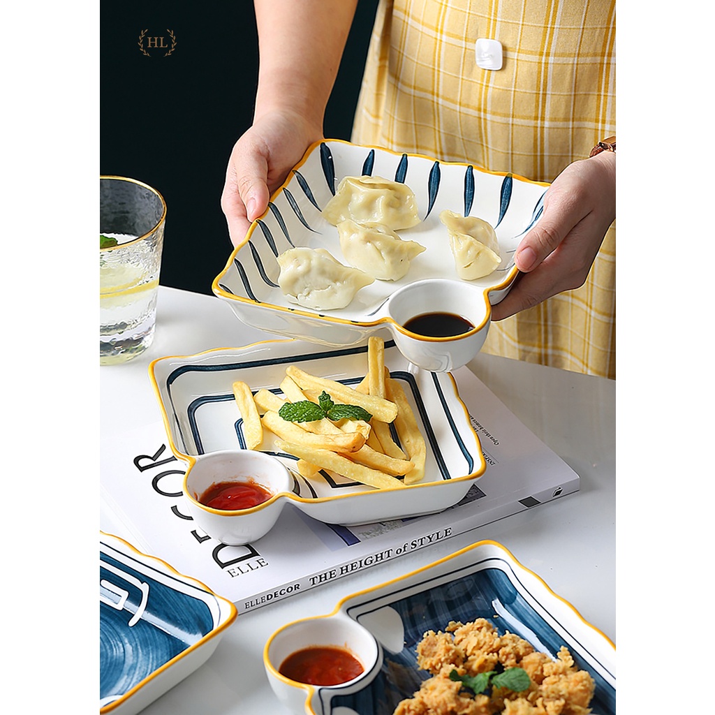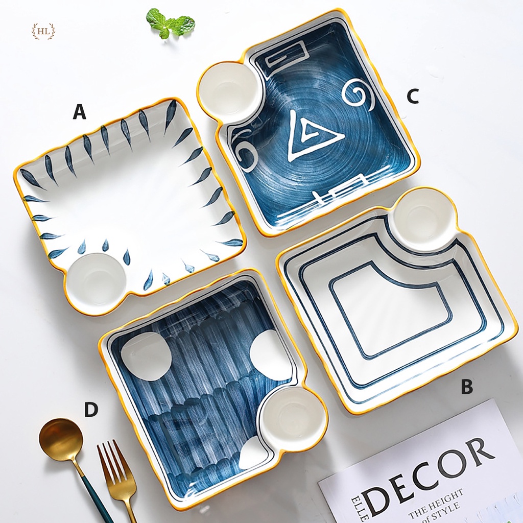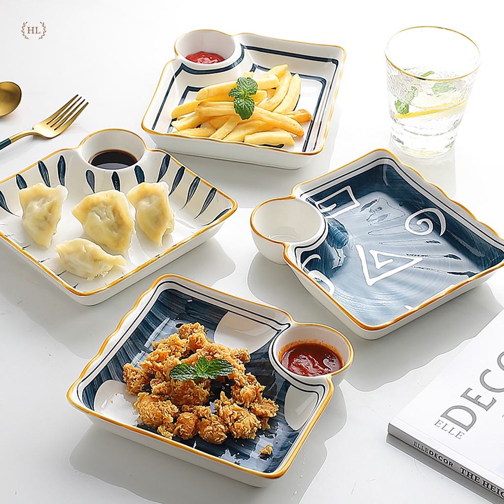 Đĩa Vuông Có Ngăn Chấm Nhật Bản | Đĩa sứ vuông cao cấp 2022 có chia ngăn đựng gia vị Phong Cách Decor Retro