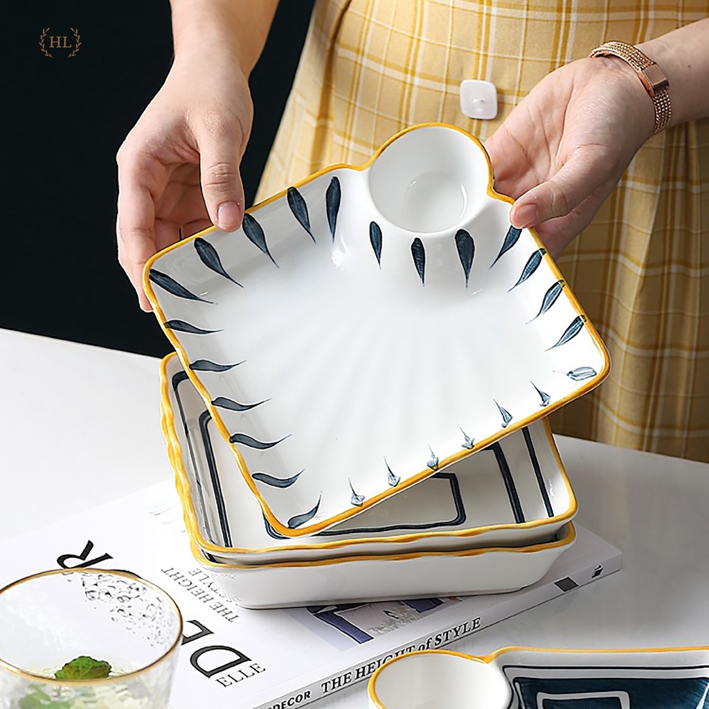Đĩa Vuông Viền Vàng Có Ngăn Chấm | Đĩa sứ vuông viền vàng cao cấp 2022 có chia ngăn đựng gia vị Phong Cách Decor VintageChất liệu: 3.5 * 17.5 cm