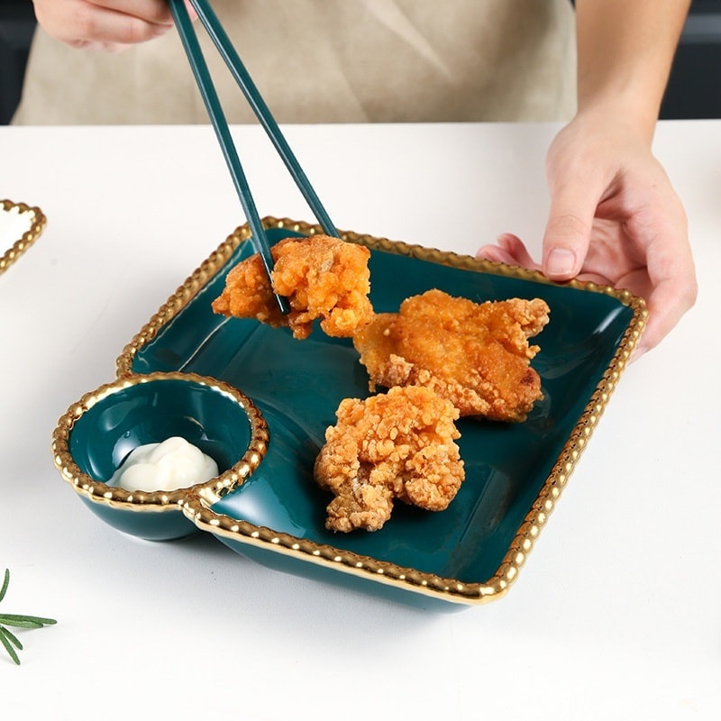 Nhà cửa & Đời sống > Bộ đồ bàn ăn > Dĩa || Đĩa vuông, khay đĩa viền vàng kèm ô chia đựng gia vị-An toàn khi sử dụngCòn hàng