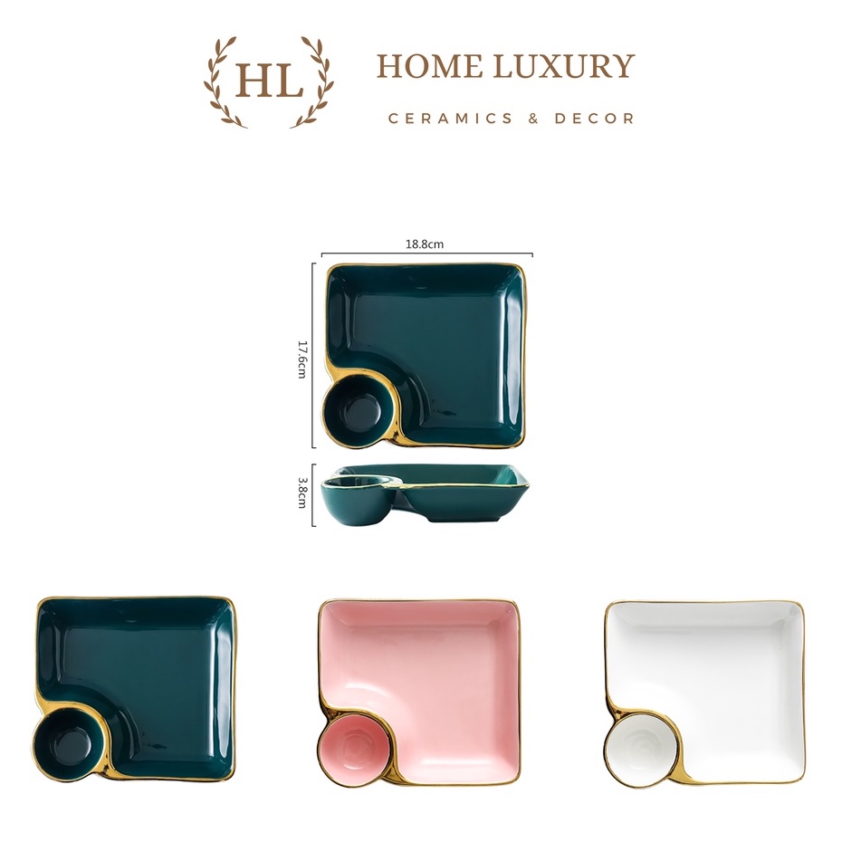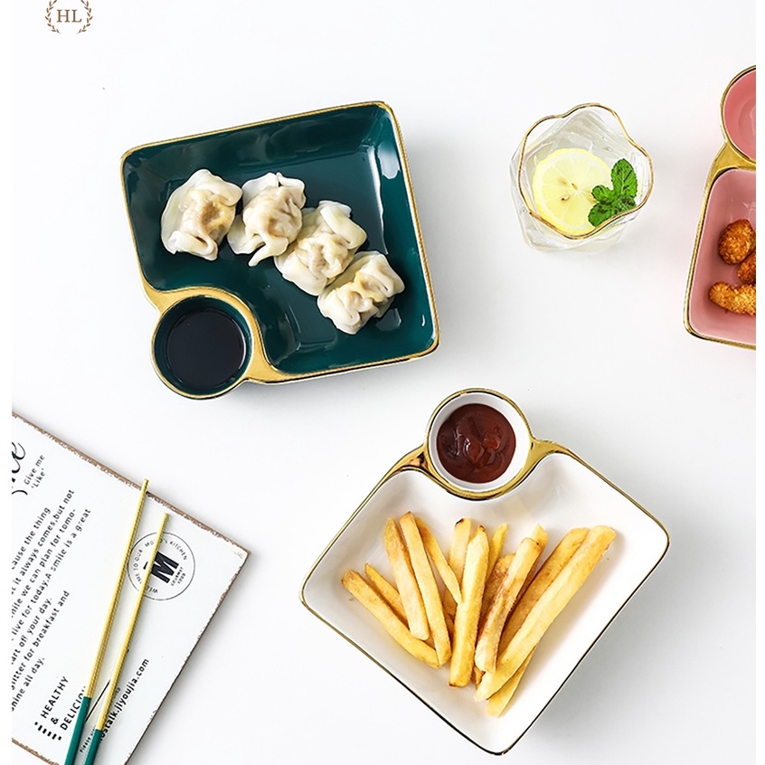 Đĩa Vuông Viền Vàng Có Ngăn Chấm | Đĩa sứ vuông viền vàng cao cấp 2022 có chia ngăn đựng gia vị Phong Cách Decor Vintage