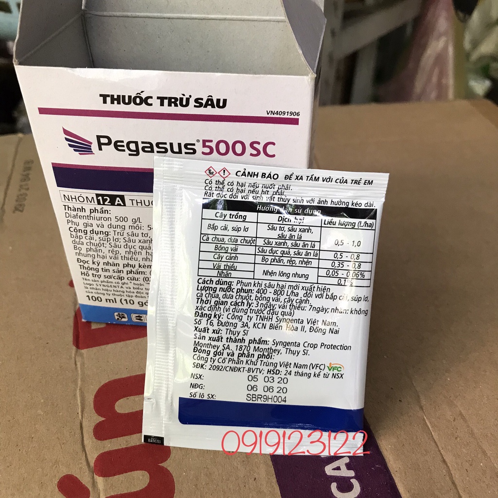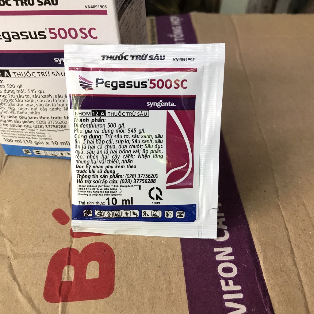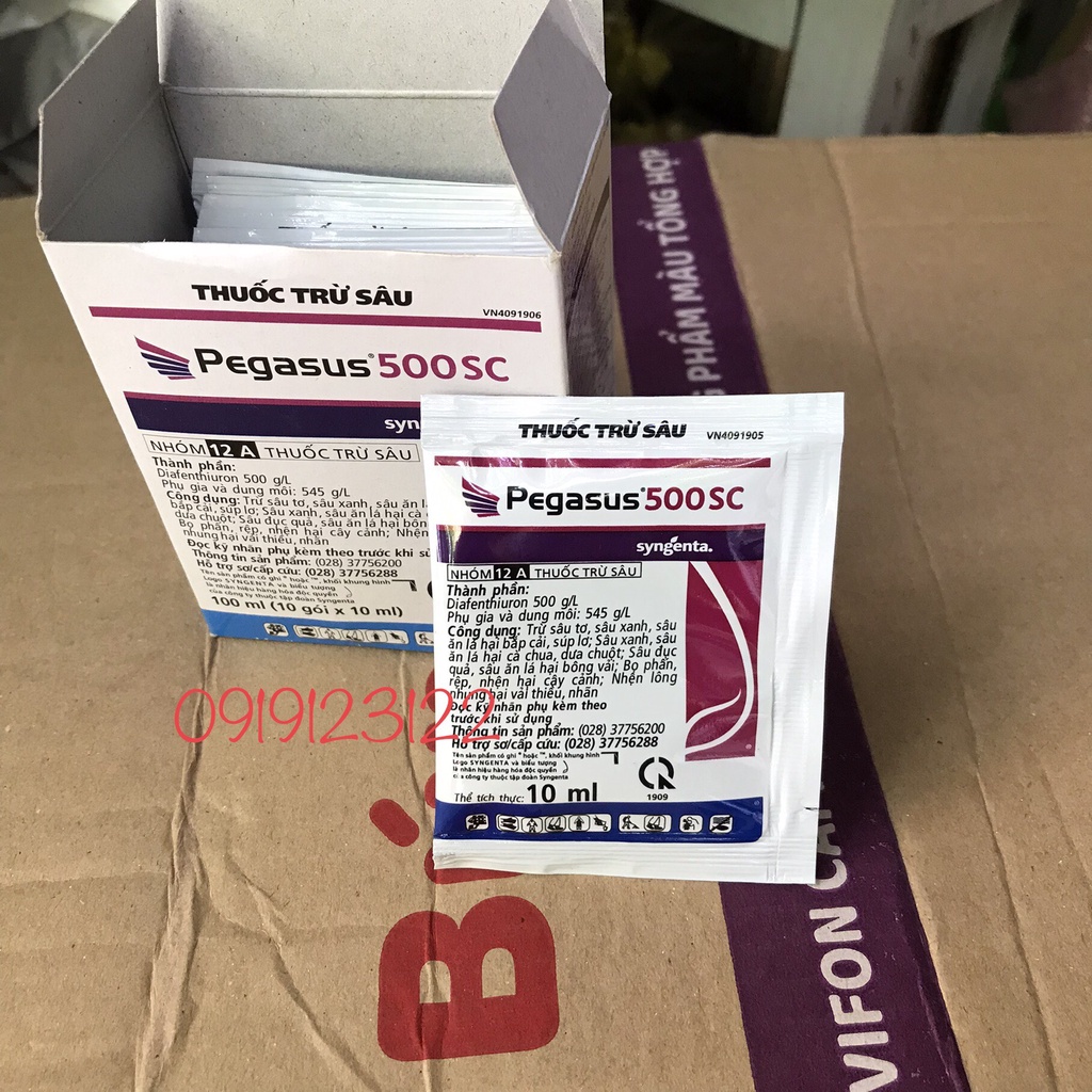 Pegasus 500SCTHUỐC TRỪ SÂU Hoạt chất : Diafenthiuron…..500g/lĐặc TínhTHUỐC TRỪ SÂU Tác động tiếp xúc, vị độc và xông hơi, sâu bị tê liệt sau khi phun thuốc, không ăn nên không còn tiếp tục gây hại và chết 2 – 5 ngày sau phun. Ngoài ra Pegasus còn diệt ấu trùng, thành trùng và trứng một số loài nhện.Ưu Điểm: Diệt trừ hữu hiệu các loài sâu khó t r ị đã kháng các loại thuốc khác (sâu tơ, sâu xanh da láng). Diệt cả sâu và một số loài nhện, tiết kiệm chi phí.Công Dụng: Đặc t r ị sâu, nhện kể cả loại đề kháng thuốc như: sâu tơ, sâu xanh, sâu ăn lá hại bắp cải, súp lơ; sâu xanh, sâu ăn lá hại cà chua, dưa chuột; nhện lông nhung hại vải thiều….Hướng dẫn sử dụng: