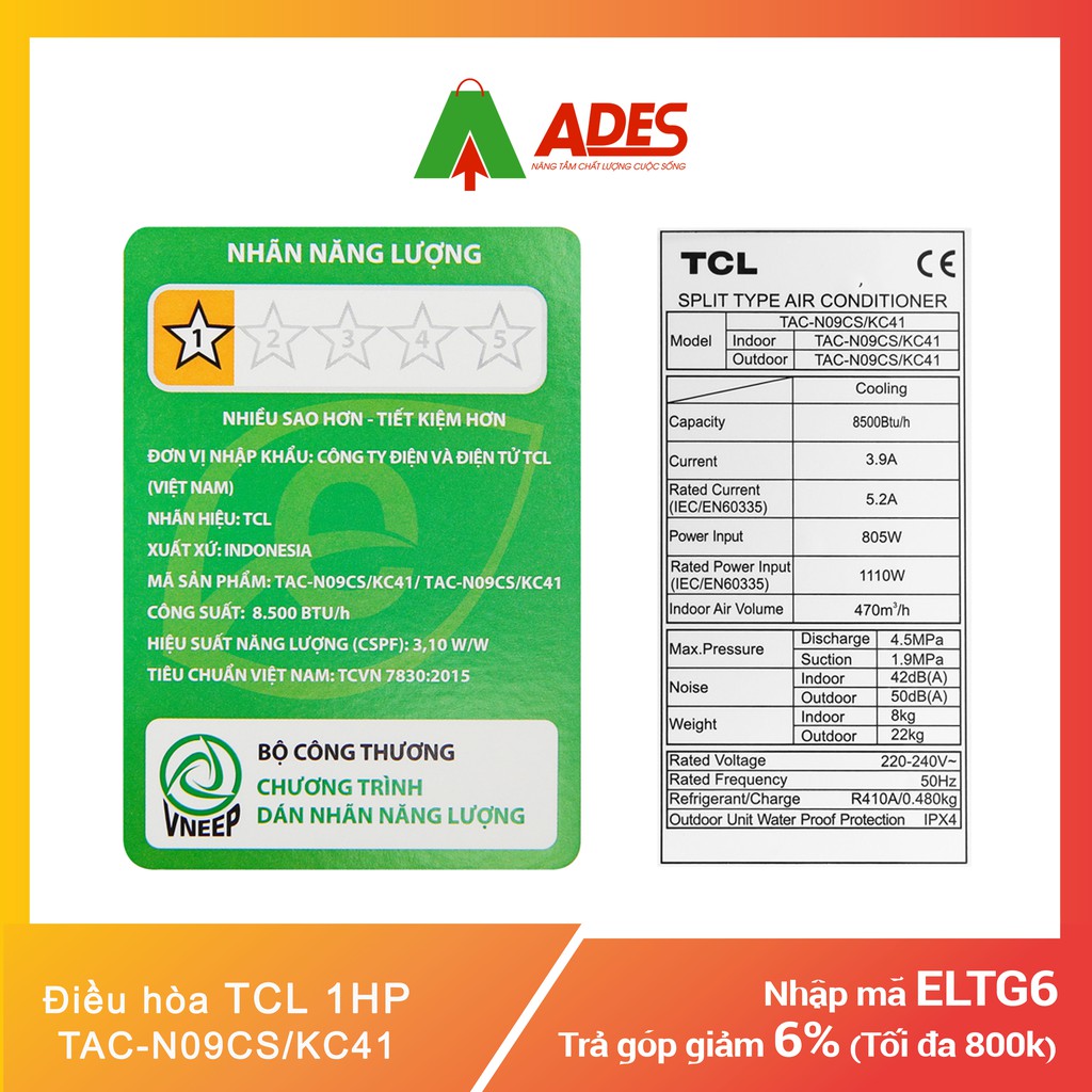 Thiết Bị Điện Gia Dụng > Thiết bị điện gia dụng lớn > Thiết bị làm mát > Điều hòa || [Mã 44ELSALE1 giảm 5% đơn 3 Triệu] Điều hòa TCL 1HP TAC-N09CS/KC41 | Chính hãng giá rẻCòn hàng