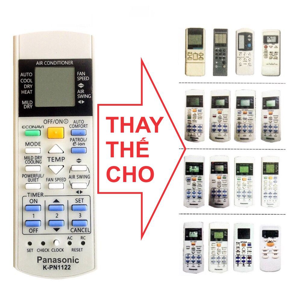 Điều khiển điều hòa Panasonic (Cho tất cả các loại máy Panasonic 1 và 2 chiều)Là chiếc điều khiển (Remote) đa năng có thể dùng thay thế được cho tất cả các loại điều khiển Panasonic như: Dòng thường (Cơ), dòng có E-ion, dòng PATROL, Inverter.