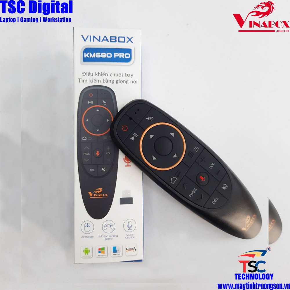 - VINABOX REMOTE KM680 Pro là thế hệ điều khiển tích hợp mic voice và chuột bay với thiết kế kiểu dáng độc đáo được ra mắt giữa năm 2020. Tương thích với tất cả các đầu Android TV Box trên thị trường. Đối với các thiết bị có tích hợp chức năng tìm kiếm bằng giọng nói thì chỉ cần bấm phím Mic trên điều khiển và nói, không phải thực hiện thêm các thao tác nào khác.