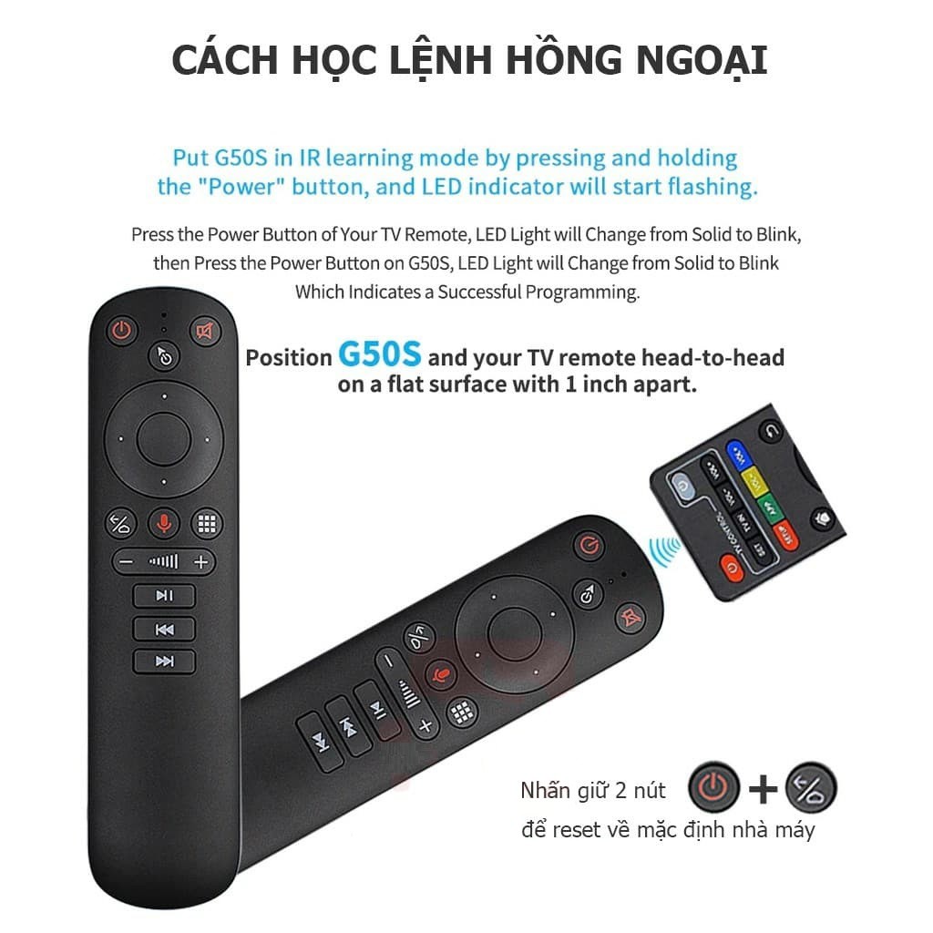 #boxtruyenhinh xin giới thiệu chuột bay G50S mới nhất. Remote voice G50S là điều khiển có tích hợp chức năng tìm kiếm giọng nói theo cơ chế của Google Assistant và thao tác đơn giản 1 chạm. Ngoài ra điều khiển còn hàng loạt các chức năng khác giúp người dùng sử dụng điều khiển thiết bị Android thuận tiện như các nút #Multimedia.Điều khiển G50s có thể học lệnh 01 phím nguồn từ các điều khiển hồng ngoại khác. Cách học lệnh tương tự như các dòng điều khiển G10s, G20s, G30s, TZ20, T1 Pro ...