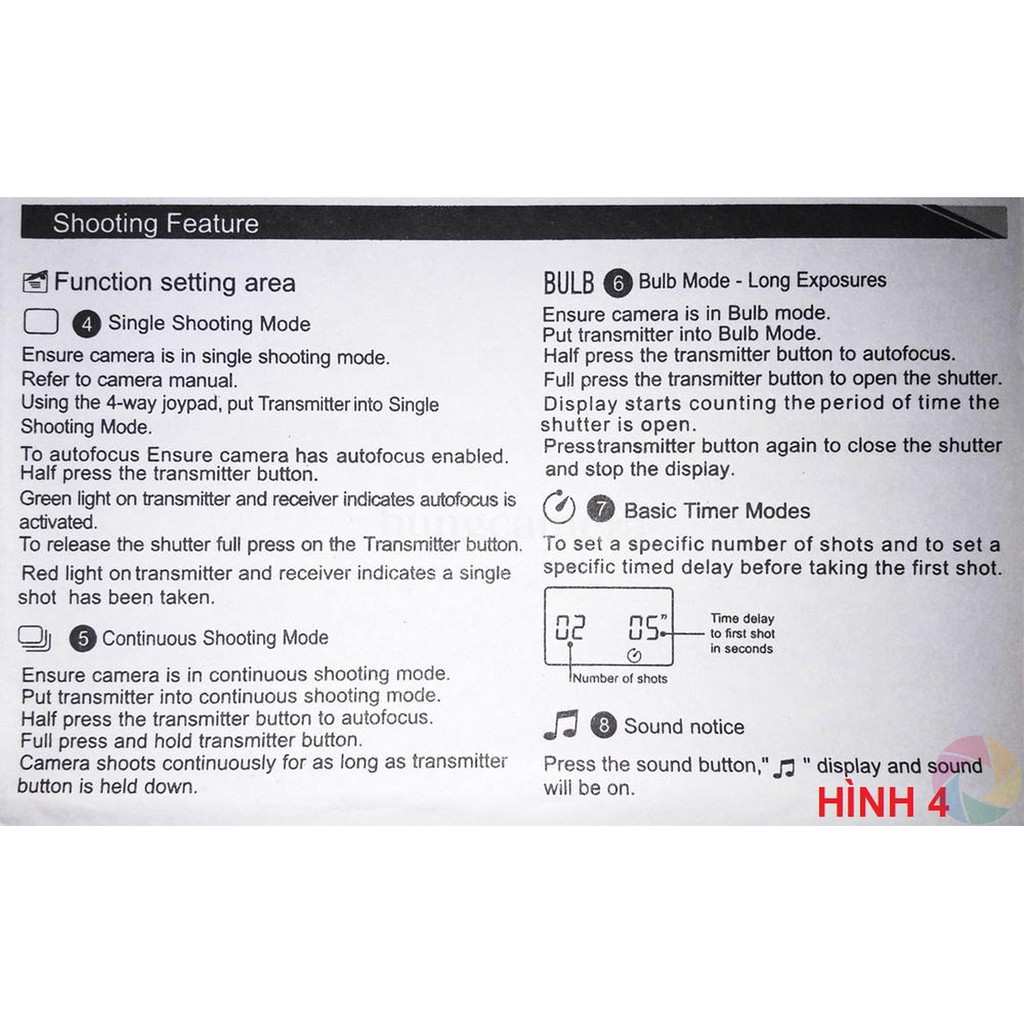 - Phù hợp với nhiều kiểu phơi sáng/ chụp hẹn giờ/ chụp timelapse/ chụp đơn/ liên tiếp/.