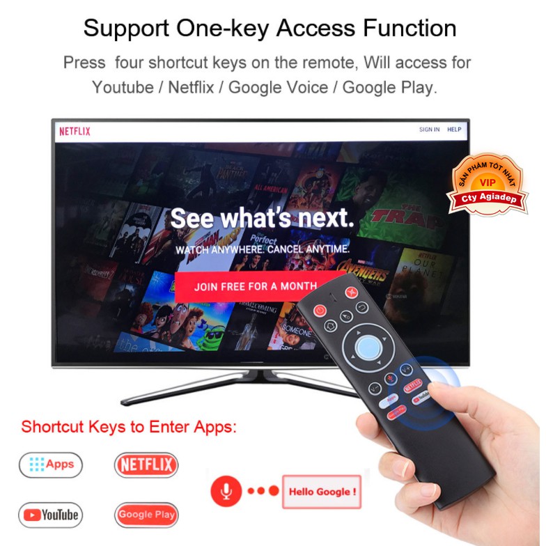 Có nút bấm riêng để vào Youtube, Google Play, NETFLIX, Apps.