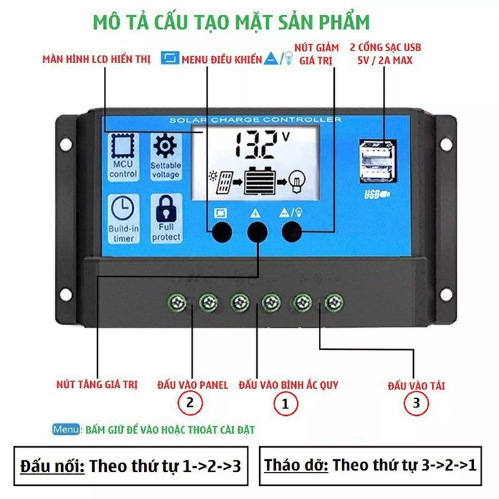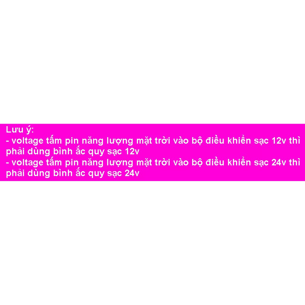 Lưu ý: đấu bộ điều khiển sạc với bình ắc quy trước. Sau đó mới đấu tấm pin NLMT, đấu tải cuối cùng