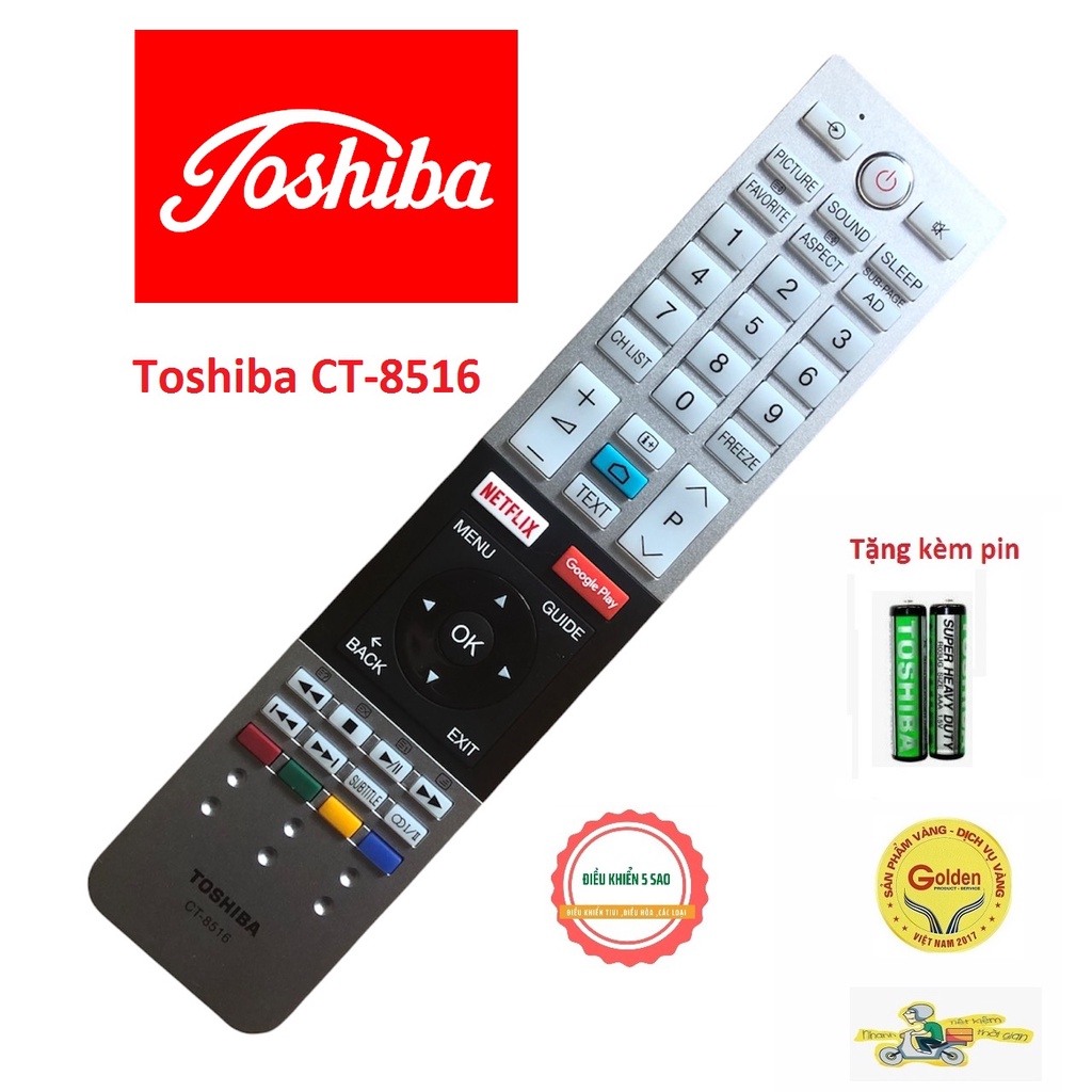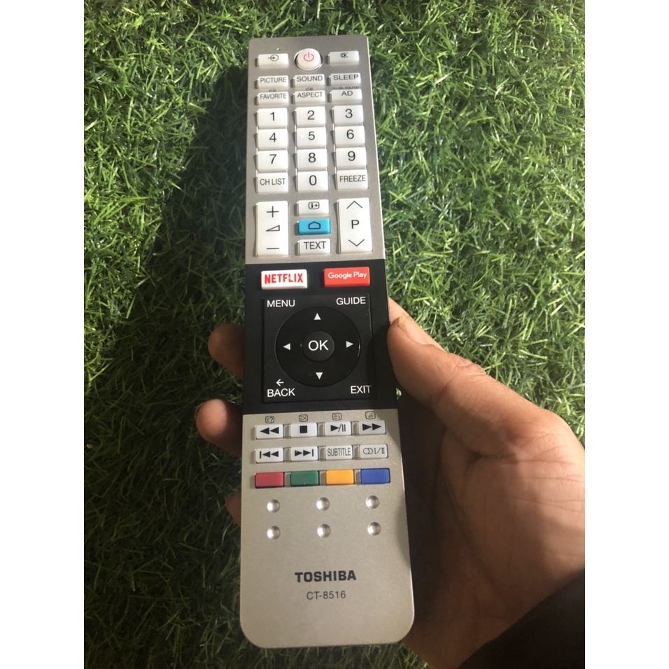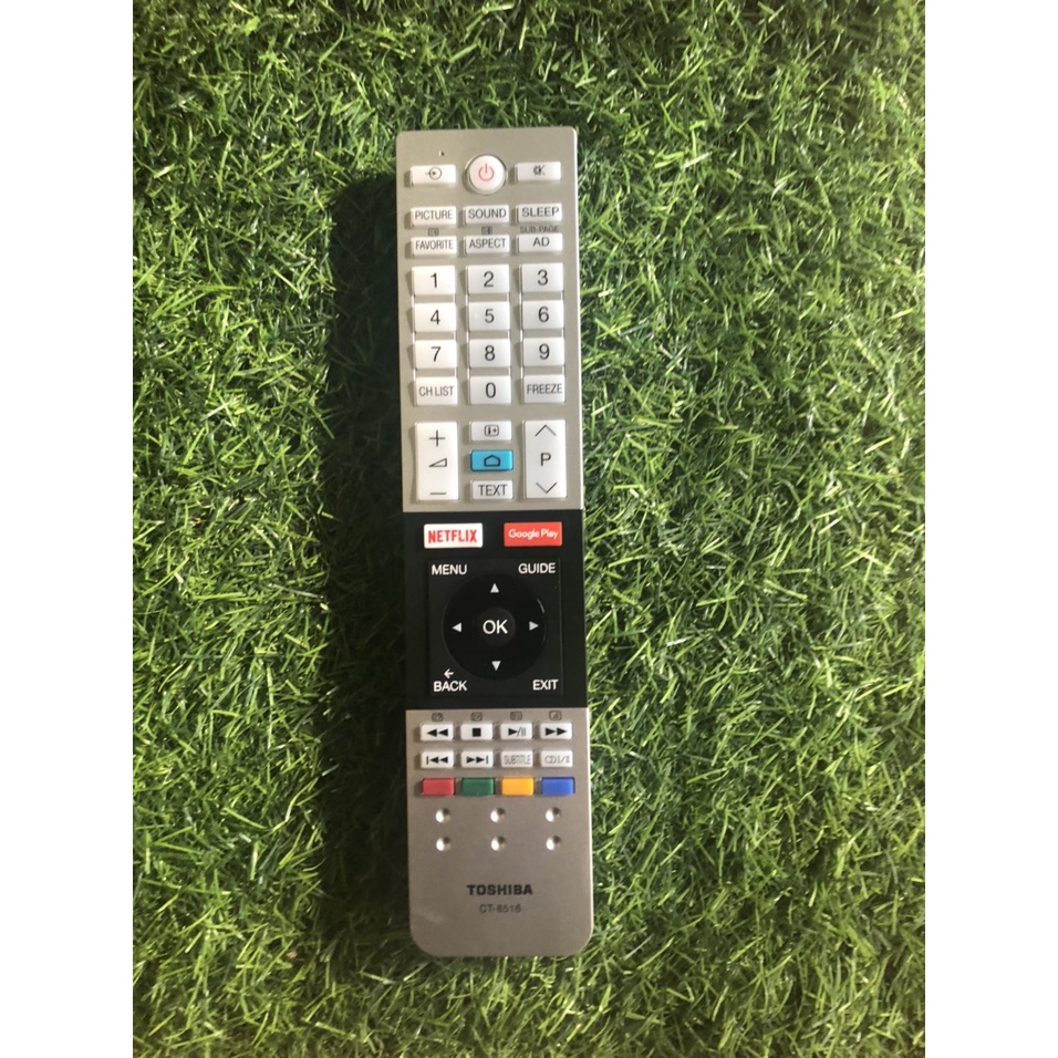 Điều khiển TV Toshiba Smart CT-8516 có thể thay thế cho mã CT-8522, CT-8514, CT-8515, CT-8521, CT-8516, CT-8517. Sản phẩm với nút NETFLIX và GOOGLE PLAY tích hợp trên remote tương thích tất cả các đời máy dòng U9850 43U7750, 49U7750, 55U7750, 65U7750, 43U9750, 49U9750, 55U9750, 65U9750 của Toshiba.