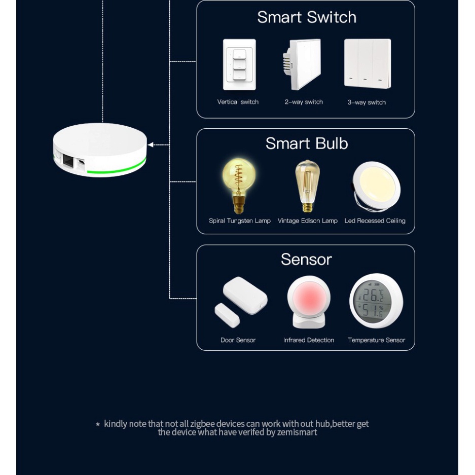 Kết nối các thiết bị thông minh sử dụng sóng zigbee như công tắc, cảm biến, ổ cắm, nút bấm không dây,... Giúp các ngữ cảnh thông minh hoạt động bình thường ngay cả khi tín hiệu internet không ổn định.