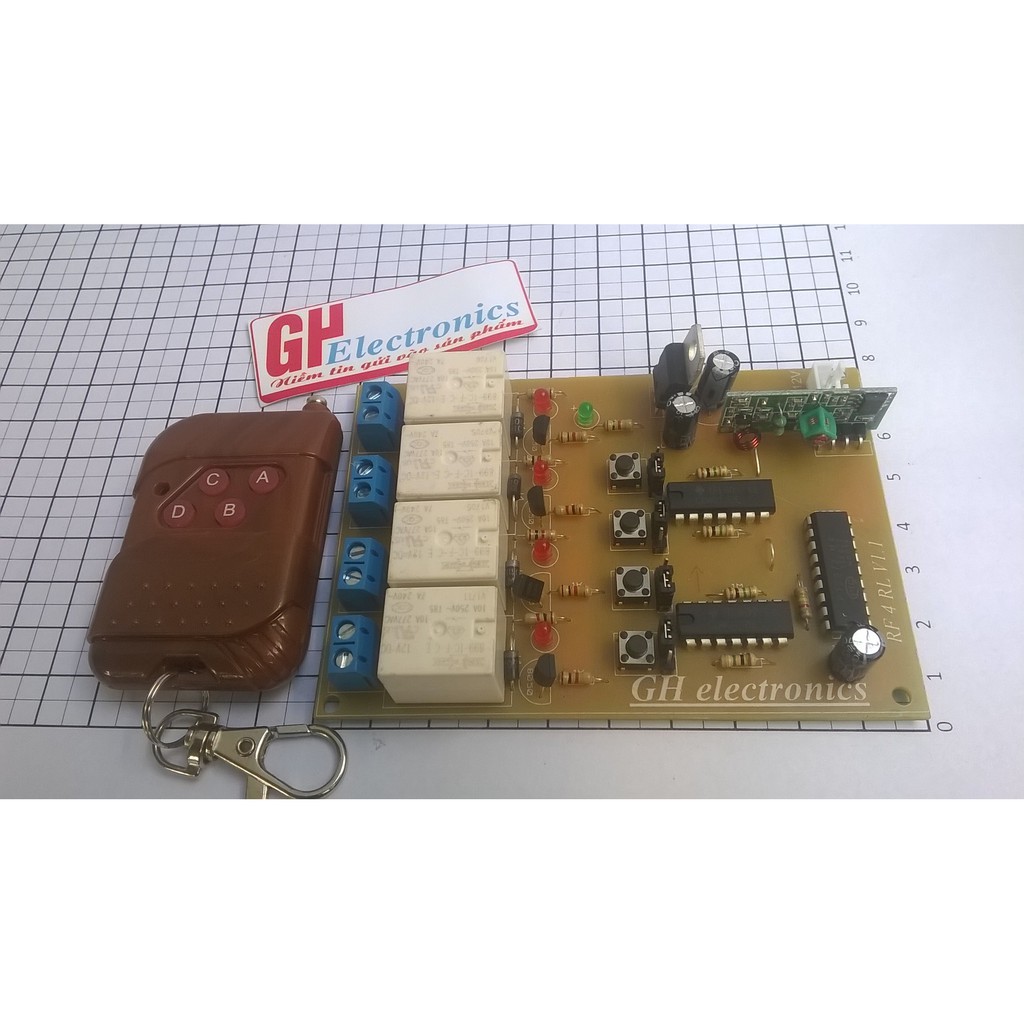 Bo mạch điều khiển từ xa 4 kênh hoạt động độc lập, 2 chức năng (chốt và không chốt).Sử dụng điện áp 12V, công suất đóng cắt 500W trở xuống (có thể mở rộng thêm).