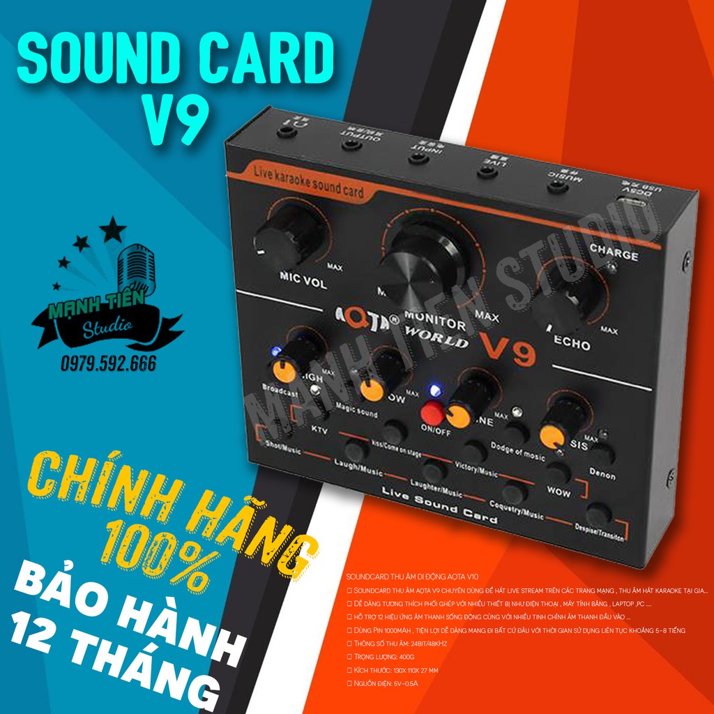 Soundcard thu âm AQTA V9 mang trên mình là 12 hiệu ứng âm thanh sống động như khả năng chèn hiệu ứng như tiếng vỗ tay , hò reo , nhạc cổ vũ , tiếng kiss ..... hứa hẹn đem lại cho bạn khá nhiều hiệu ứng thu âm cực kì thú vị và đi kèm với đó là những núm xoay tròn để điều chỉnh âm thanh đầu vào có thể chinh tỉnh những âm thanh từ micro , echo , âm bass treble ....