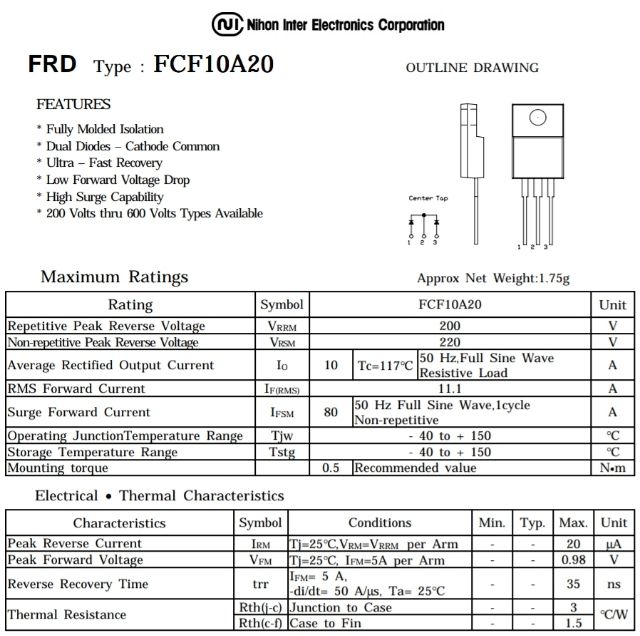 Giới thiệu Diode xung đôi, kép 220V 10A FCF10A20