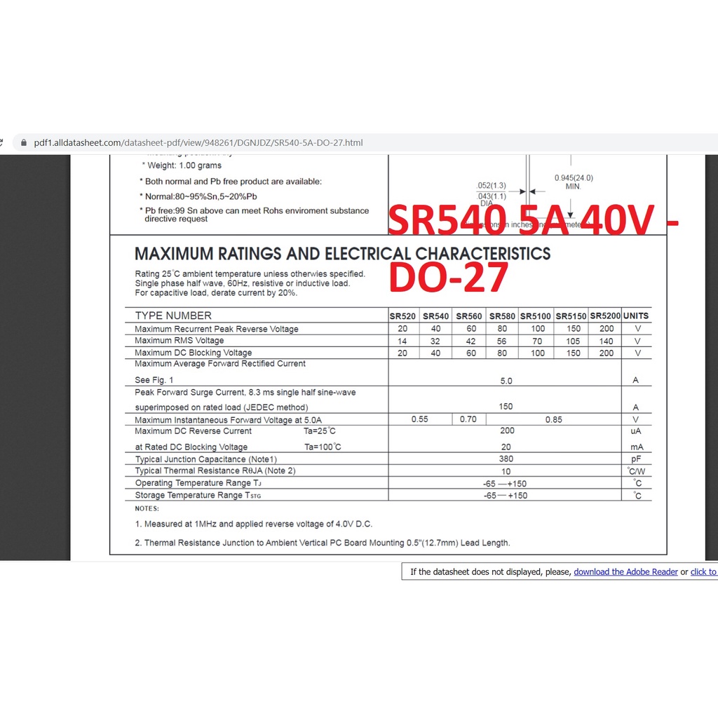 Máy tính & Laptop > Linh Kiện Máy Tính > Bộ Lưu Điện || Điốt (diode) Schottky SR540 5A 40V - DO-27Còn hàng