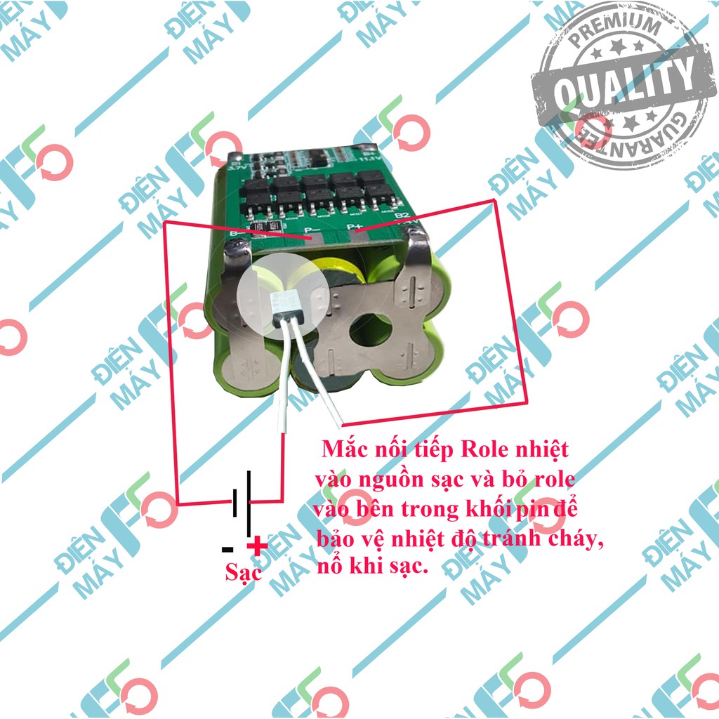 - Hướng dẫn SD: Mắc nối tiếp role với cực + của nguồn sạc, bỏ role vào giữa khối pin hoặc thiết bị cần bảo vệ. Trong trường hợp rủi ro có phát sinh về nhiệt độ, role sẽ ngắt dòng sạc, tránh cháy nổ. (Minh họa cụ thể trong ảnh mô tả sản phẩm)