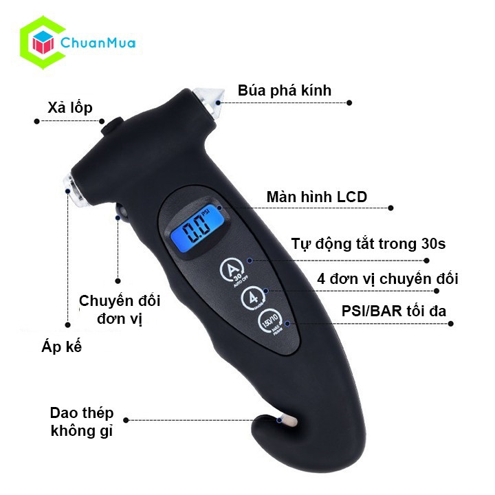 Nhà cửa & Đời sống > Dụng cụ & Thiết bị tiện ích > Dụng cụ > Dụng cụ đo lường || Đo cảm biến áp suất lốp xe ô tô, xe máy đèn led LCD ( Điện tử, Van trong, 4in1: Đo lốp, Xả hơi, Búa phá kính, Dao thép )Còn hàng