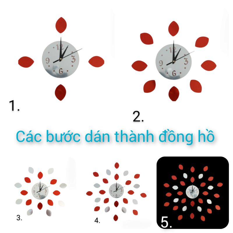 Đồng hồ gương dán tường mẫu hình tia lá. Bạn sẽ tự tay dán nên hình hài chiếc đồng hồ của bạn.HDSD: gắn phần mặt đồng hồ, bóc lớp phim bảo vệ bề mặt của mặt đồng hồ, các chi tiết rồi bóc lớp giấy dán phía sau chi tiết và dán vào các vị trí (có thể dán theo hình sản phẩm hoặc tùy ý bạn).