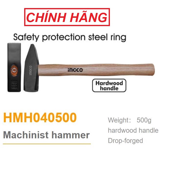 Trọng lượng: 500g. tay cầm bằng gỗ cứng. Đầu búa được rèn khuôn. Xử lý nhiệt, thép cacbon 45 #