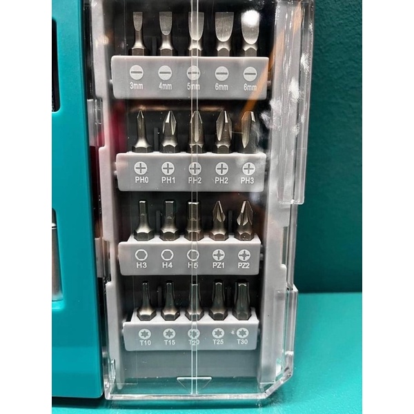 Gồm 20 tua vít 6.35 x 25mm theo szie: PH0,PH1,PH2,PH2,PH3,SL3,SL4,SL5,SL6,SL6,HEX3,HEX4,HEX5,PZ1,PZ2,T10,T15,T20,T25,T30 1 cái đầu điều hợp size 4-6mm(25mm) . 1cái đầu cắm điều hợp size 1/4"-3/8" . 1cái đầu giữ bằng nam châm size 125mm bits