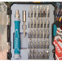 Bao gồm: 1 tay cầm khắc hiệu TOTAL, 1 đầu giữ mũi 4x60mm, 30 tua vít dài 4x28mm:SL1.5,SL2,SL2.5,SL3,SL3.5,SL4,PH000,PH00,PH0,PH1,T4,T5,T6,T7,T8,T9,T10,T15,T20,H0.9,H1.3,H1.5,H2,H2.5,H3,H4,Y2,U2.6,Five Star0.8,Five Star1.2 ,Five Star0.8,Five Star1.2 thích hợp cho iPhone and ipad. 120/T