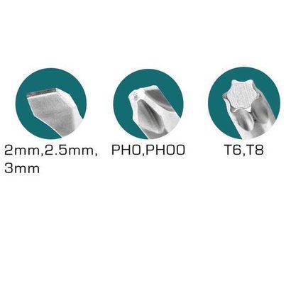 Bộ 7 cái vít chuẩn gồm: SL2.0*50,SL2.5*50SL3.0*50, PH00*50,PH0*50,T6*50,T8*50. Chất liệu CR-V. Tay cầm tiện dụng, thoải mái - 120/T