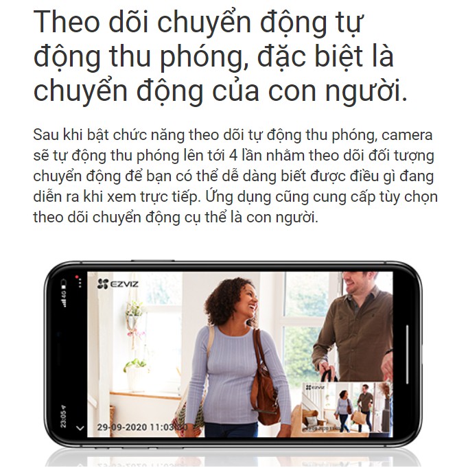 Sau khi bật chức năng theo dõi tự động thu phóng, camera sẽ tự động thu phóng lên tới 4 lần nhằm theo dõi đối tượng chuyển động để bạn có thể dễ dàng biết được điều gì đang diễn ra khi xem trực tiếp. Ứng dụng cũng cung cấp tùy chọn theo dõi chuyển động cụ thể là con người.