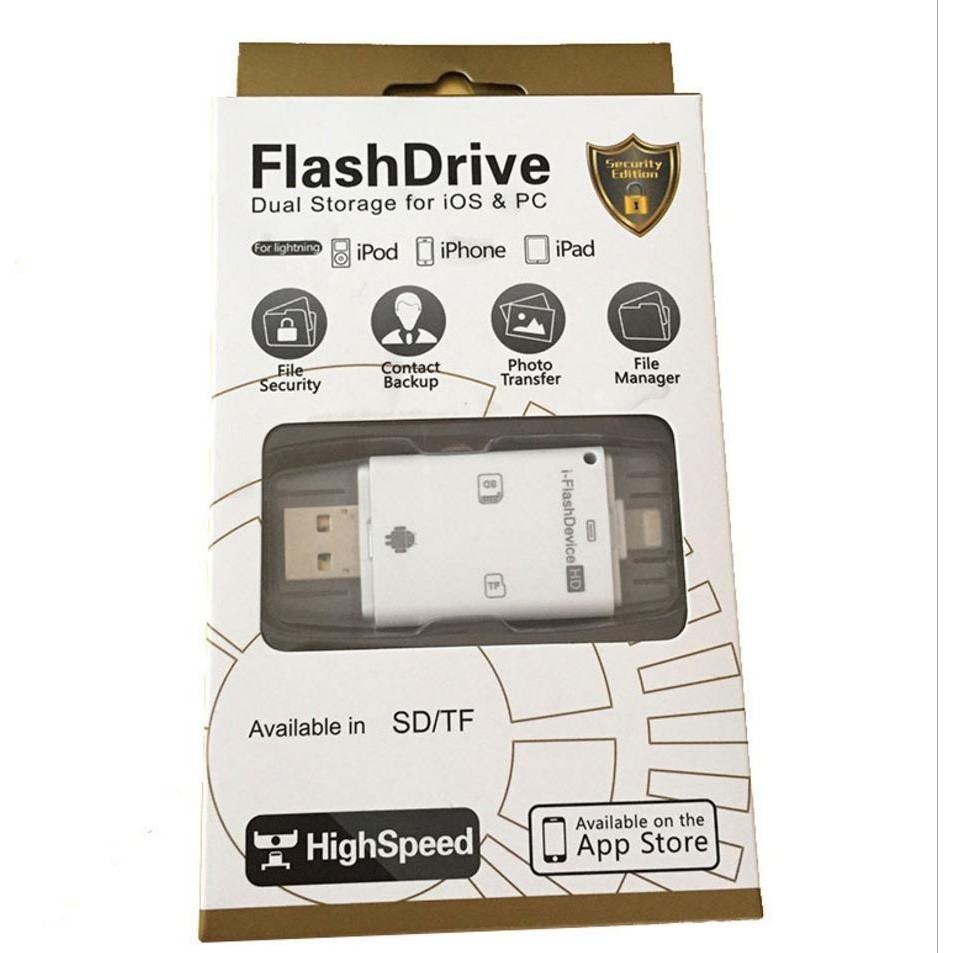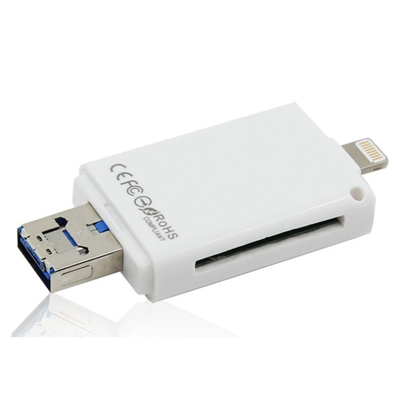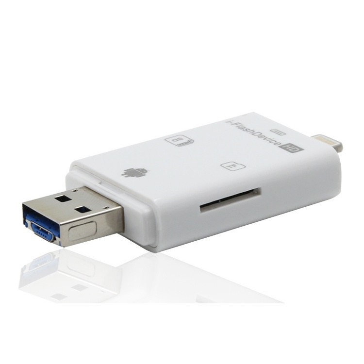 Đầu đọc thẻ nhớ FlashDevice dành cho IPhone/ IPad/ Android OS. Bộ đầu đọc thẻ nhớ đa năng đọc thẻ micro của điện thoại và thẻ SD của máy ảnh. Đầu đọc thẻ nhớ cho IPhone/IPad/ Android OS có 3 đầu cắm kết nối với nhiều thiết bị khác nhau để dễ dàng chụp hình ảnh, dự liệu 1 cách nhanh chóng từ điện thoại sang laptop và ngược lại.Trên đầu đọc FlashDevice có 3 cổng :