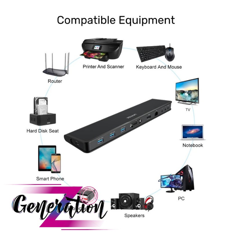Dock cắm USB này tương thích với cả thiết bị ngược dòng USB-C và USB-A. Nó kết hợp ba cổng USB 3.1 Gen1 5Gbps, đầu ra màn hình kép, cổng âm thanh tai nghe và micrô, cổng Gigabit Ethernet RJ45, vào một đế cắm duy nhất để có năng suất tối đa.
